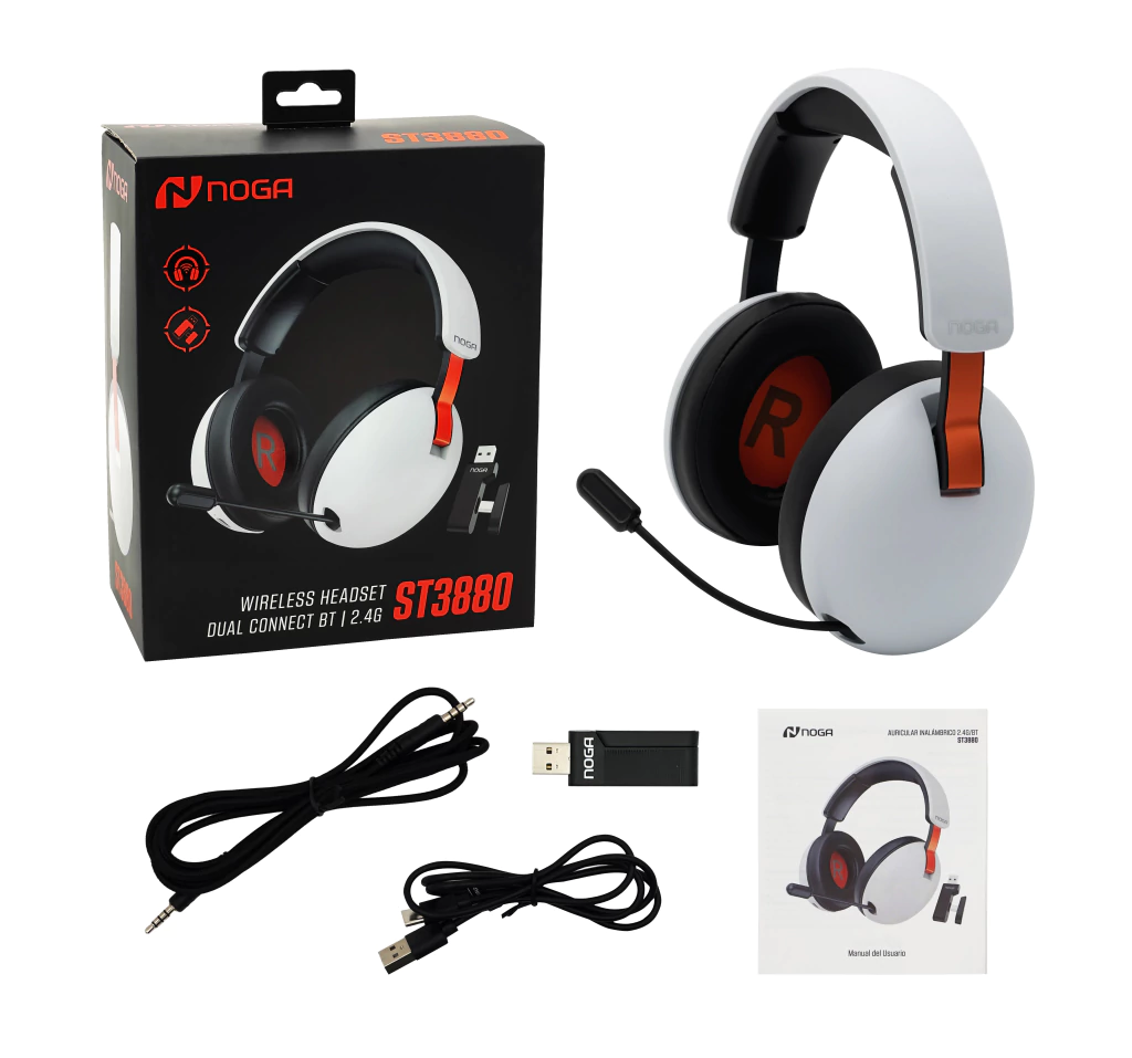 Los Auriculares Inalámbricos NOGA ST‑3880 son versátiles y completos, pensados para ofrecer conectividad triple (Bluetooth, 2.4 GHz y cable Plug 3.5 mm) en un solo dispositivo. Perfectos para gaming en consolas, PC y para escuchar música o hacer llamadas en móviles y tablets.