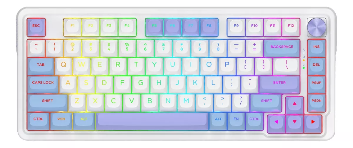 El Ucal Pro es un teclado mecánico 75% con teclas premium de PBT, triple conexión, amortiguación gasket, rueda de control y batería de duración extra larga. Además, está equipado con iluminación RGB y un software renovado para la personalización total.