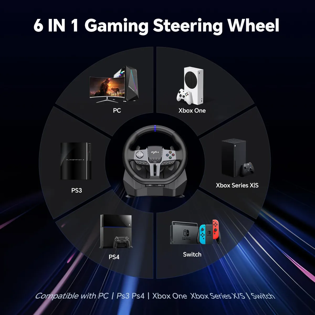 El PXN V9 Gen2 es un set de simulación de conducción completo que incluye volante, pedales y palanca de cambios. Diseñado para ofrecer una experiencia inmersiva y realista, brinda compatibilidad multiplataforma y un control preciso para todo tipo de juegos de carreras.